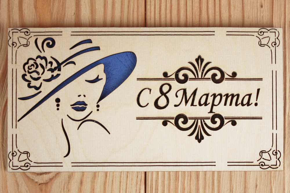 Подарочный конверт "С 8 Марта!" с дамой (9,2*17,5) Фанера 3мм, картон, оформл., Синий, 1 шт.