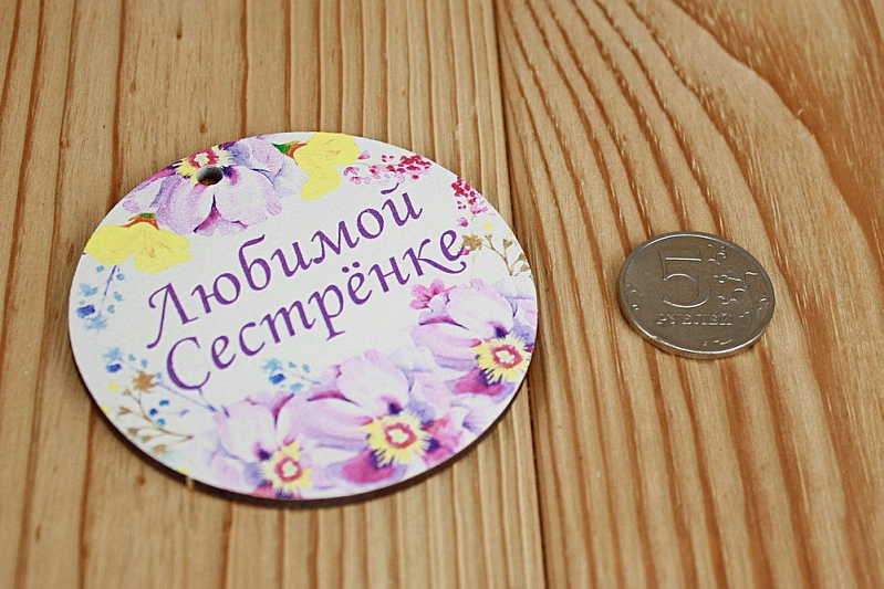 Шильдик "Любимой сестрёнке" круг (7,3*7,3) МДФ 3мм, УФ печать, Уп-10 шт.