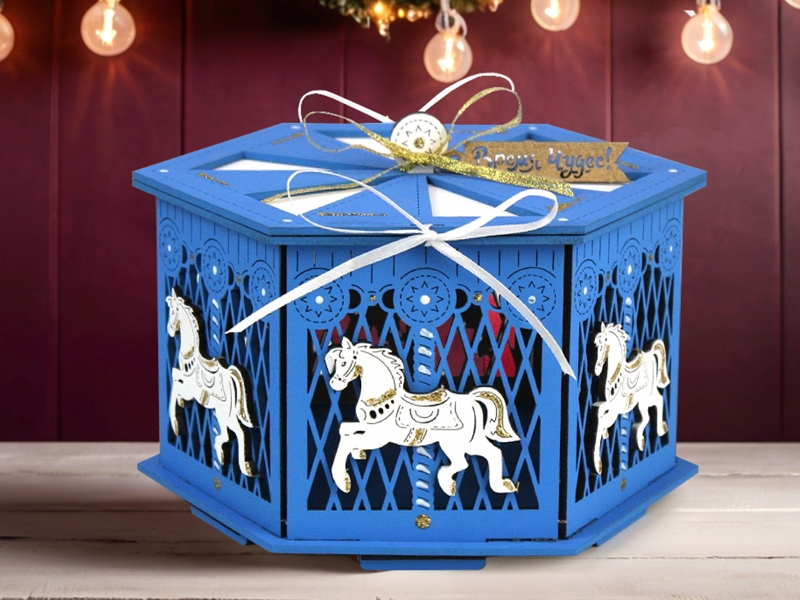 Изготовленная из качественного МДФ, эта упаковка не только красива, но и прочна. 🐴 Сине-белый цвет и ажурный рисунок с лошадками создают атмосферу сказки и волшебства. 🎠