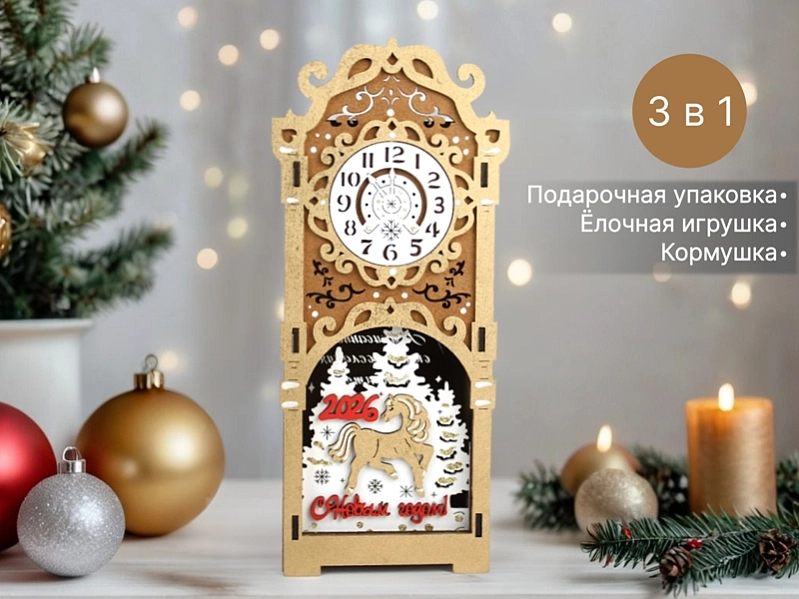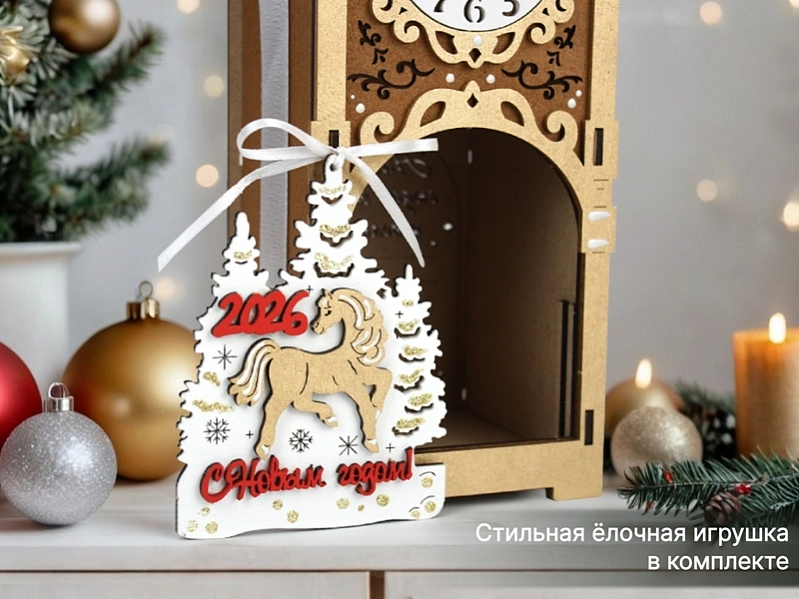 ПУ891-02-3701 Подарочная упаковка-кормушка, с ёлочной игрушкой "Лошадка 2026" (12*10*27) МДФ, окрашен. морилкой, оформл., Дуб-золото, 1 шт.