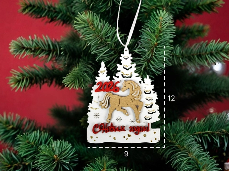 - Оформление: Красивая ёлочная игрушка в виде лошадки, символизирующей 2026 год.