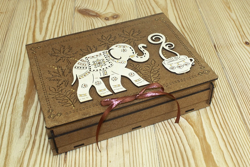 - Оформление: Коробка окрашена морилкой и декорирована изображением слона, что придает ей особый шарм и изысканность.