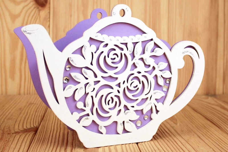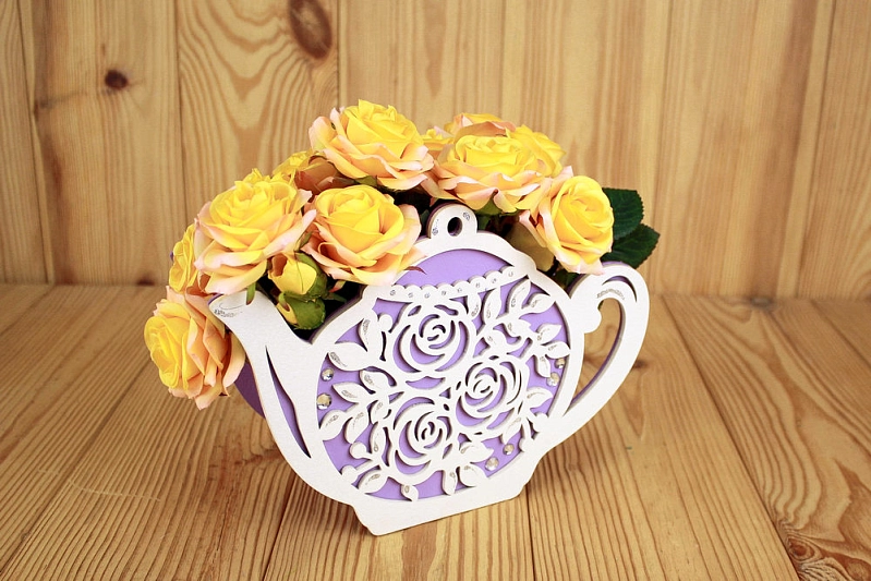 ПУ713-02-0903 Подарочная упаковка-чайник с розами (24,5*8,5*17) МДФ 3мм, окрашен., оформл., Сиреневый-белый, 1 шт.