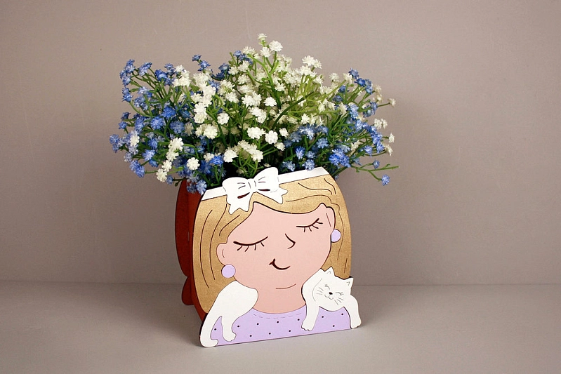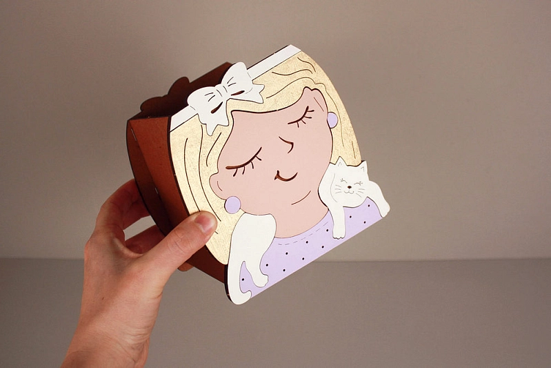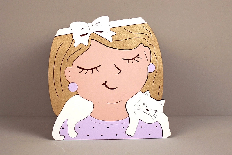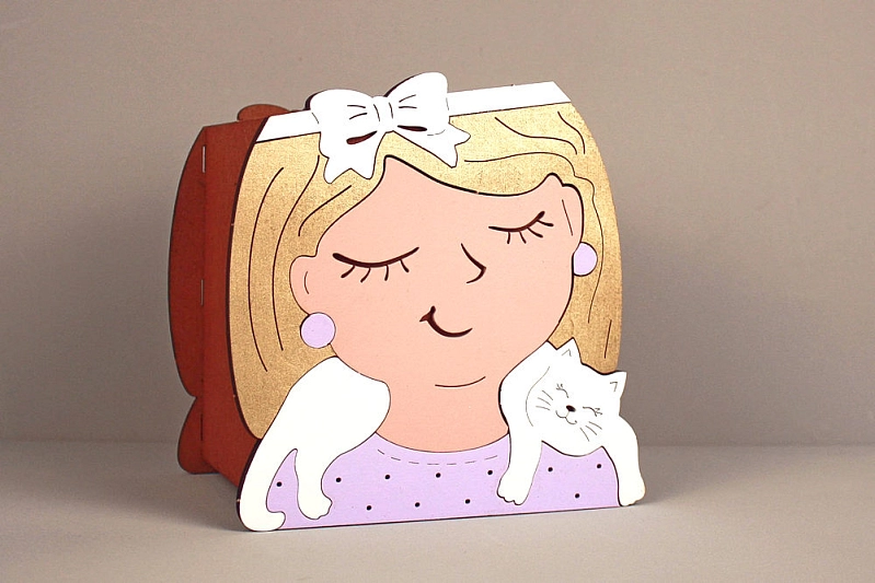 ПУ782-02-3740 Подарочная упаковка "Девочка с котиком" (14,5*11*15) МДФ, окрашен. морилкой, оформл., Дуб-сиреневый пастель, 1 шт.