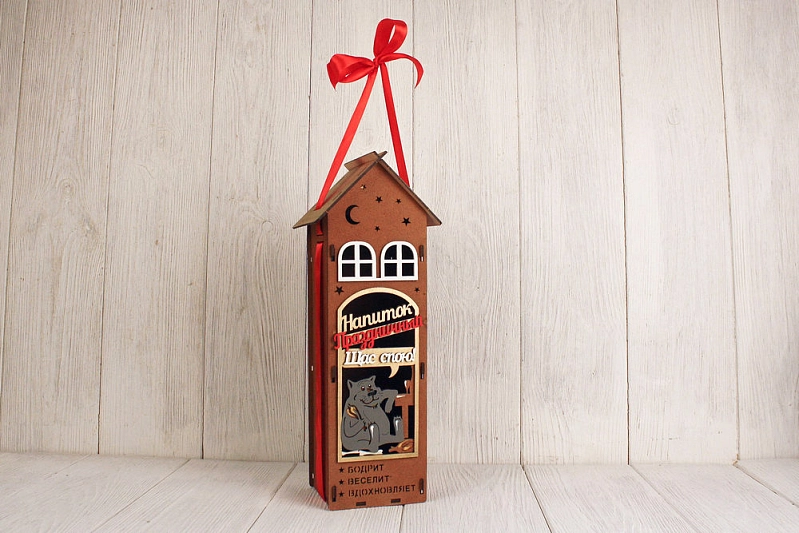 ПУ793-02-3706 Подарочная упаковка для бутылки"Напиток Праздничный" (13,5*11,5*36,5) МДФ 3мм, окрашен. морилкой, оформл., Дуб-красный, 1 шт.