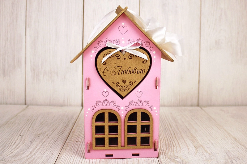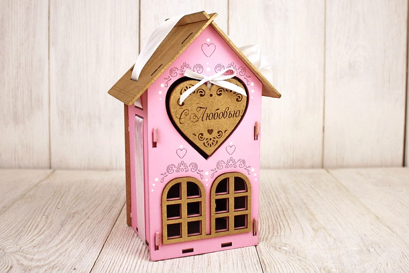 ПУ721-02-3901 Подарочная упаковка-дом "С любовью!" малый (13,5*11,5*21) МДФ 3мм, окрашен., оформл., Розовый пастель-золото, 1 шт.