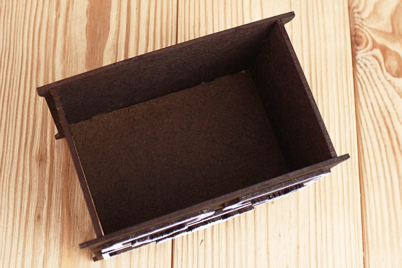 Эта упаковка выполнена из качественного МДФ и окрашена морилкой, что придает ей благородный вид. Сочетание эбенового дерева и белого цвета создает элегантный и стильный образ.
