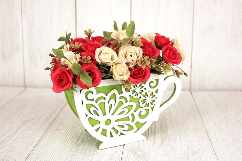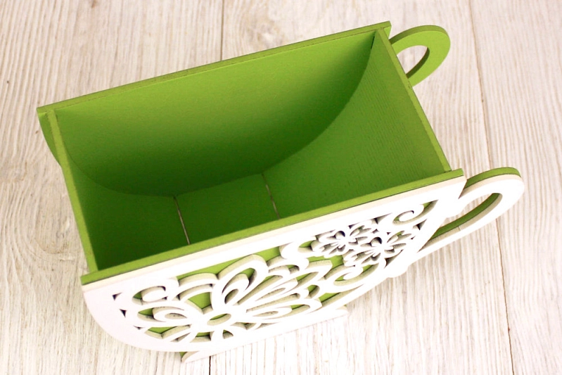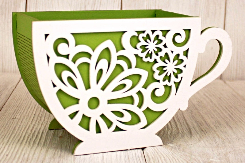 ПУ530-02-1303 Подарочная упаковка "Кружка" с цветами (18,3*8,1*11) МДФ 3мм, окрашен., оформл., Салатовый-белый, 1 шт.