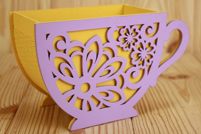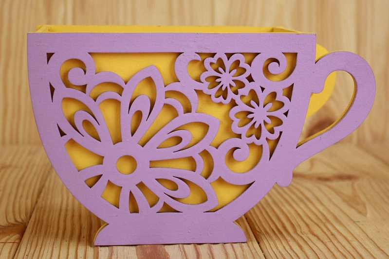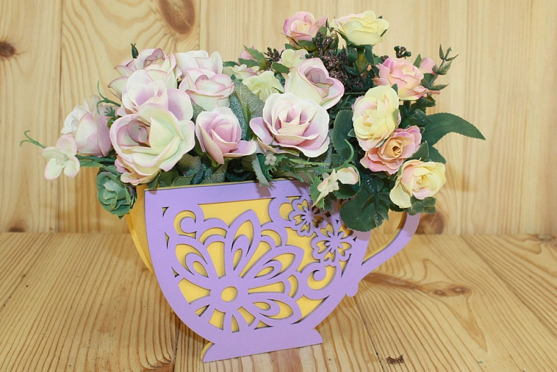 ПУ530-02-1609 Подарочная упаковка "Кружка" с цветами (18,3*8,1*11) МДФ 3мм, окрашен., оформл., Желтый-сиреневый, 1 шт.