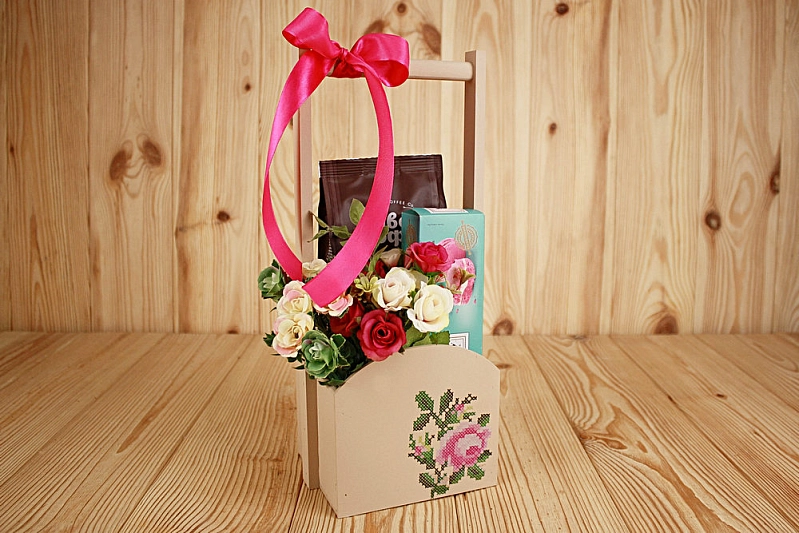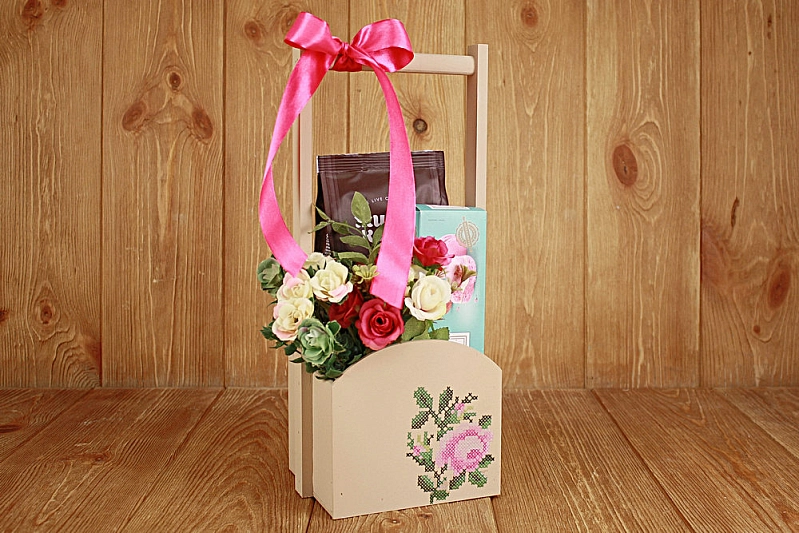 Я226-02-2800 Ящик-корзинка "Роза. Вышивка" (15,5*13*36,5) Фанера 3мм, дерево, фанера 8мм, окраш., УФ печать., Бежевый, 1шт.