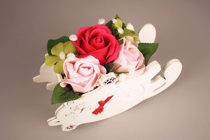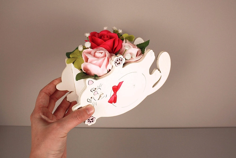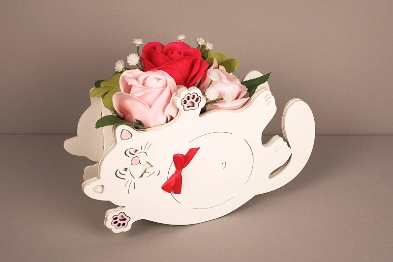 Ищете оригинальный и трогательный подарок? Этот очаровательный букет в форме котика станет прекрасным выражением ваших чувств! Изготовленный из качественного МДФ и нежных мыльных цветов, он порадует своей изысканностью и долговечностью.