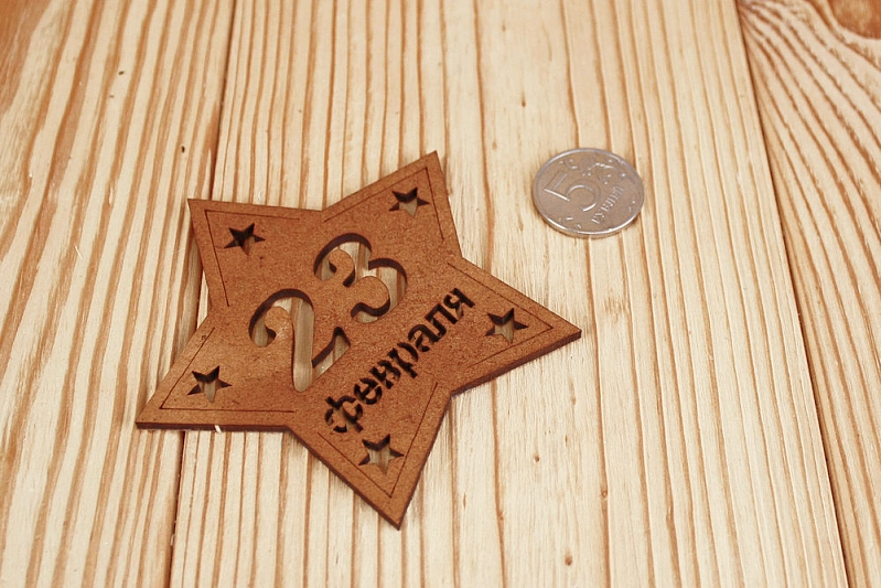 Шильдик-звезда "23 февраля" (9,5*8,5) МДФ 3мм, окрашен. морилкой, Дуб, Уп-10 шт.