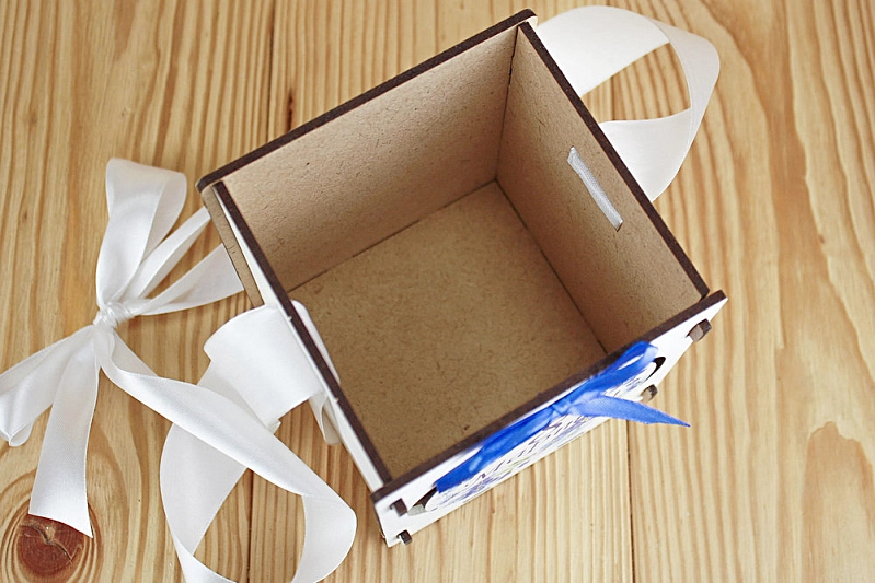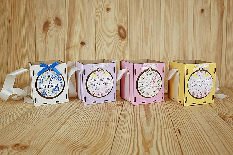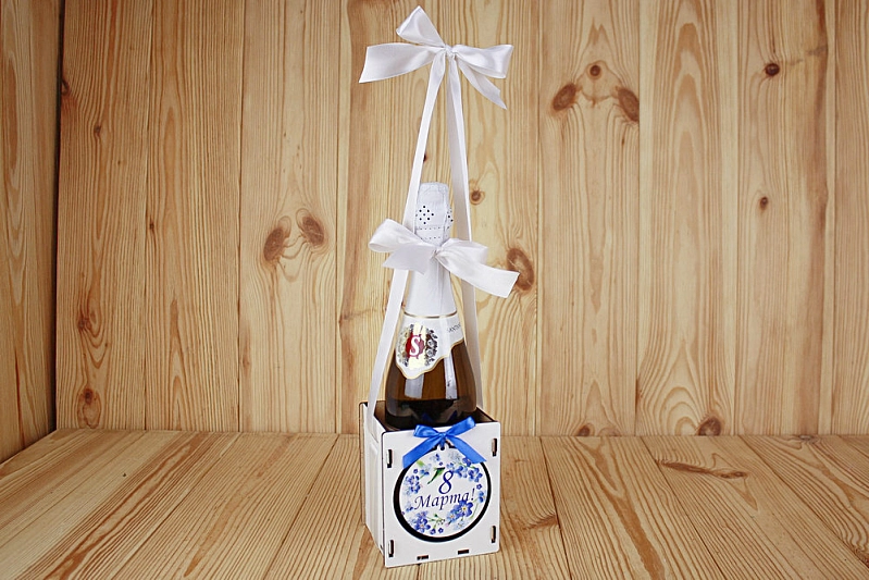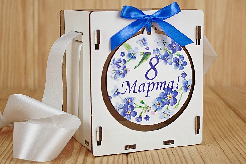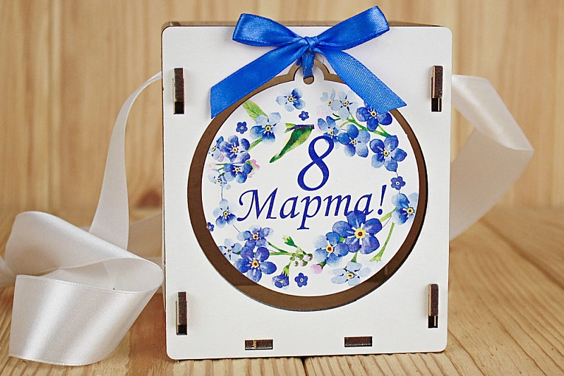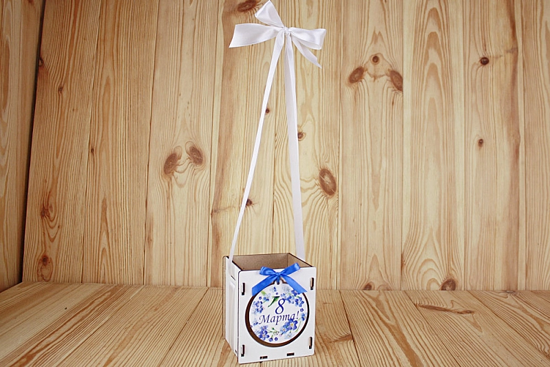 ПУ607-02-0303 Подарочная упаковка "8 марта!" с синими цветами (10,5*10,5*12) МДФ 3мм, УФ печать, окраш., оформл., Белый-белый, 1 шт.