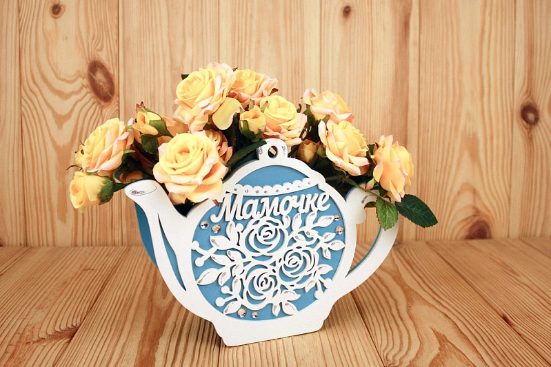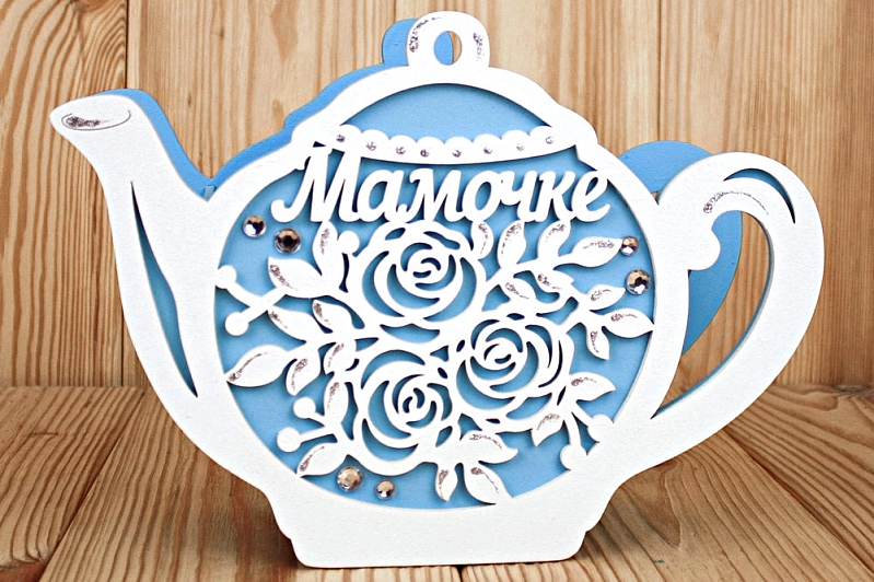 ПУ700-02-0703 Подарочная упаковка-чайник "Мамочке" (24,5*8,5*17) МДФ 3мм, окрашен., оформл., Голубой-белый, 1 шт.