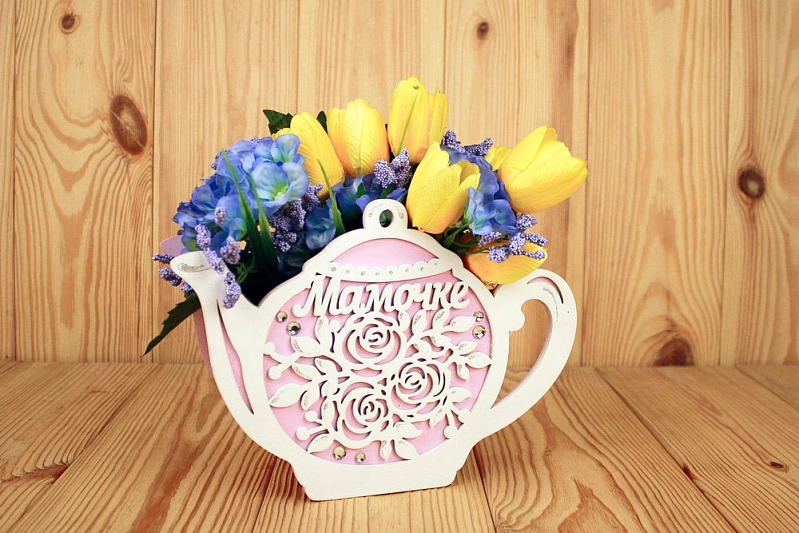 ПУ700-02-3903 Подарочная упаковка-чайник "Мамочке" (24,5*8,5*17) МДФ 3мм, окрашен., оформл., Розовый пастель-белый, 1 шт.