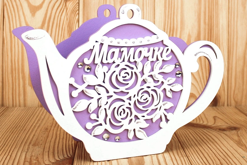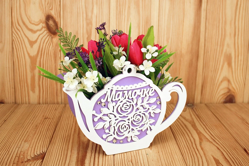 ПУ700-02-0903 Подарочная упаковка-чайник "Мамочке" (24,5*8,5*17) МДФ 3мм, окрашен., оформл., Сиреневый-белый, 1 шт.