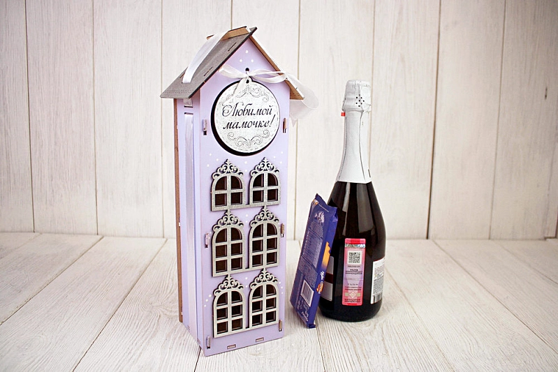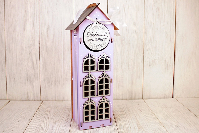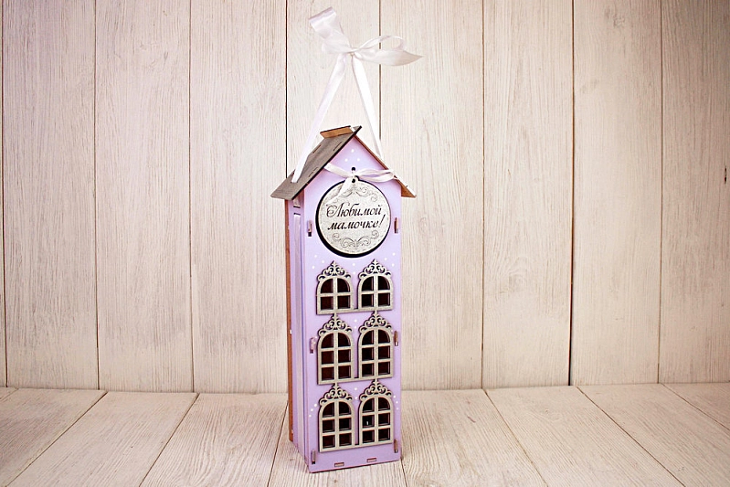 ПУ716-02-4002 Подарочная упаковка-дом "Любимой мамочке!" большой (13,5*11,5*36,5) МДФ 3мм, окрашен., оформл., Сиреневый пастель-серебро, 1 шт.