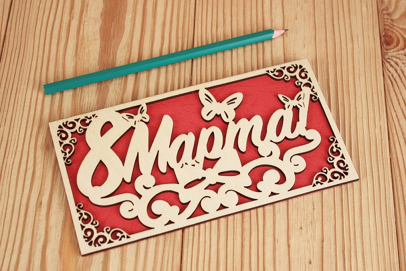 Подарочный конверт "8 Марта!" (9,2*17,5) Фанера 3мм, картон, оформл., Красный, 1 шт.