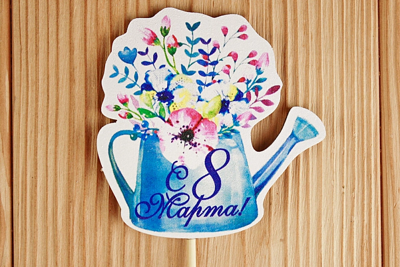 Тп277-02-0000Н Топпер-лейка "С 8 Марта" (8,3*28) МДФ 3мм, УФ печать, на шпажке, Уп-10 шт.