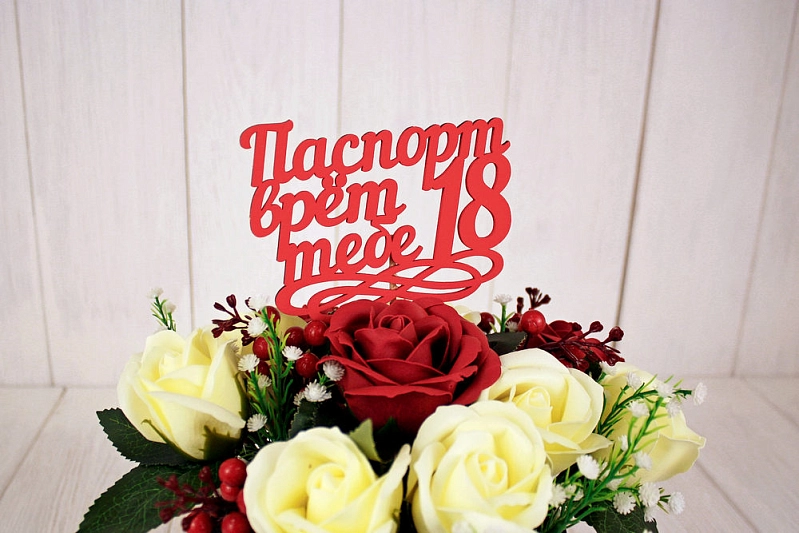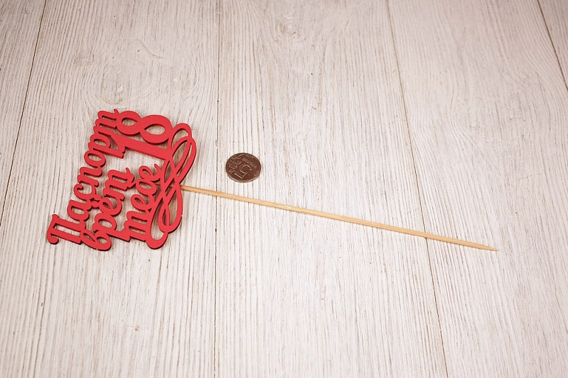 Топпер "Паспорт врёт, тебе 18" (11,5*30) МДФ 3мм, окрашен. на шпажке, Красный, Уп-10 шт.