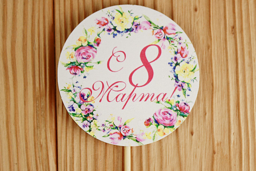 УФ-печать обеспечивает яркий и долговечный рисунок, который не выцветает и не стирается. Топпер выполнен в форме круга с поздравительной надписью к 8 Марта, что делает его идеальным украшением для праздничного стола. 🌸