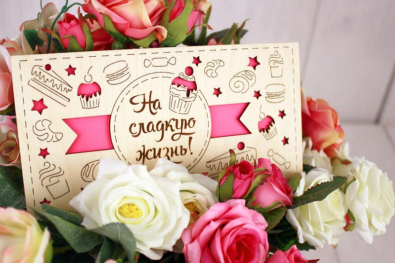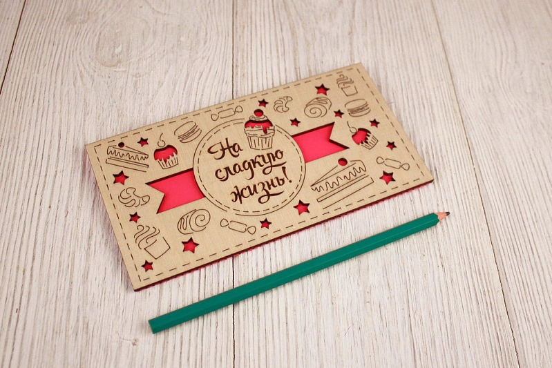 Подарочный конверт "На сладкую жизнь!" (9,2*17,5) Фанера 3мм, картон, оформл., Розовый, 1 шт.