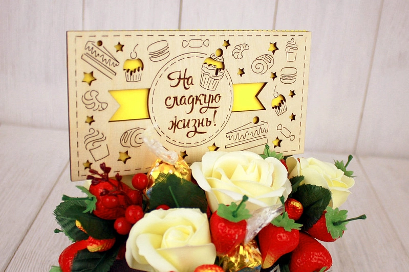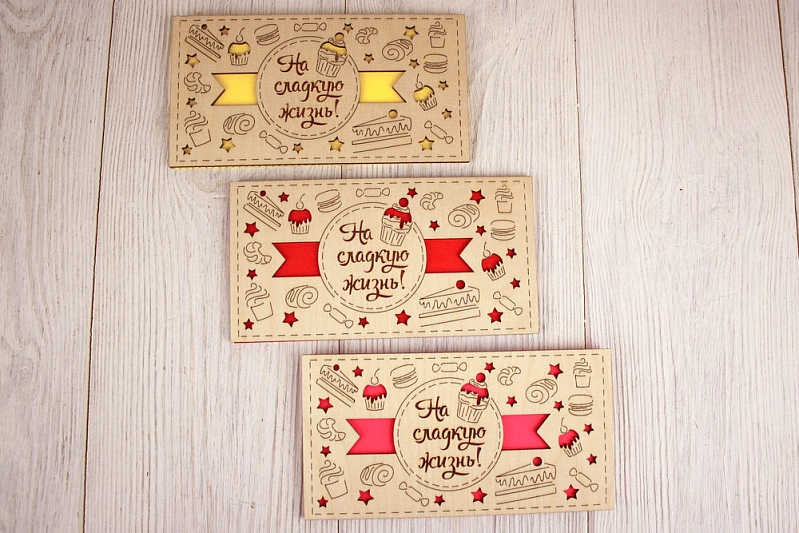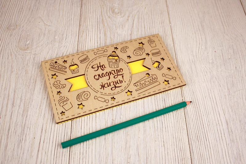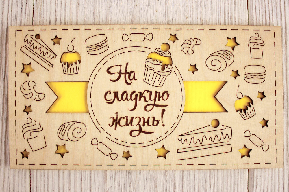 Подарочный конверт "На сладкую жизнь!" (9,2*17,5) Фанера 3мм, картон, оформл., Желтый светл., 1 шт.