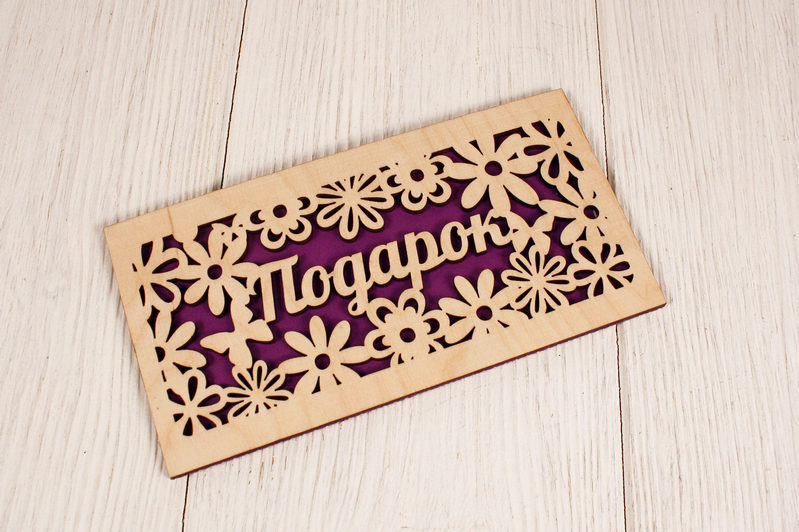 Подарочный конверт "Подарок" (9,2*17,5) Фанера 3мм, картон, оформл., Фиолетовый, 1 шт.