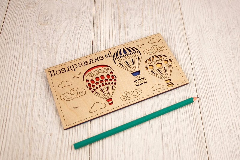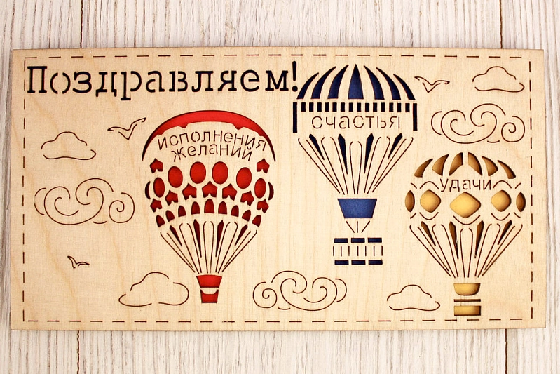 Подарочный конверт "Поздравляем!" с шарами (9,2*17,5) Фанера 3мм, картон, оформл., Синий, 1 шт.