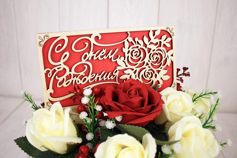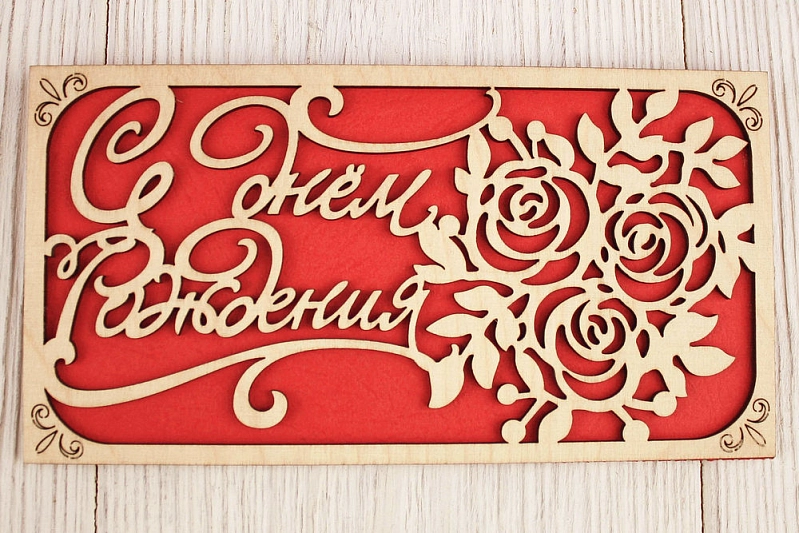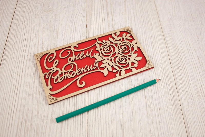 Подарочный конверт "С днём Рождения" с розами (9,2*17,5) Фанера 3мм, картон, оформл., Красный, 1 шт.