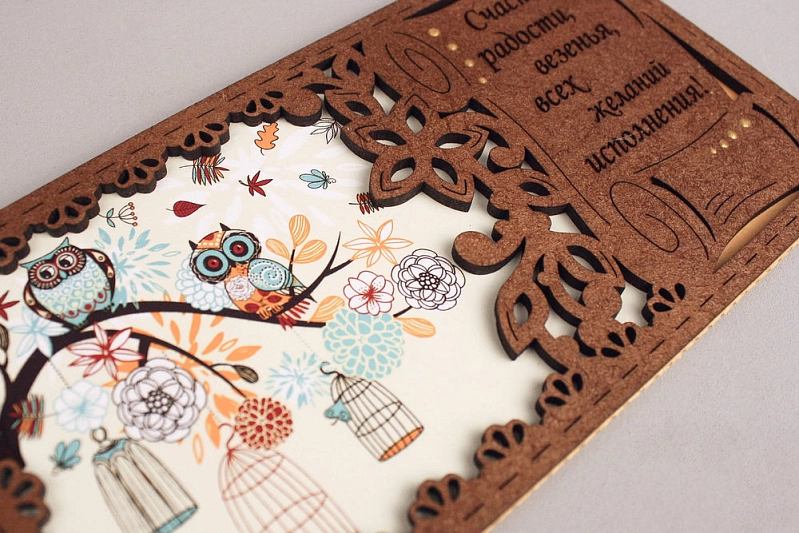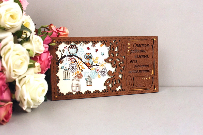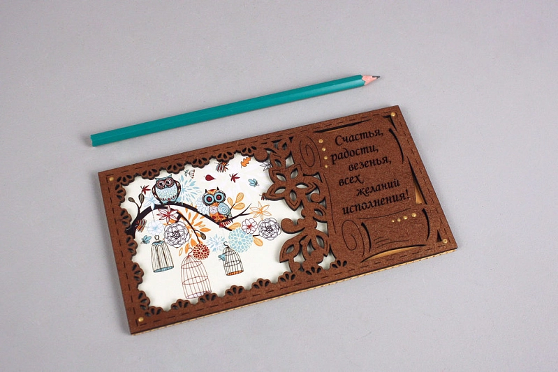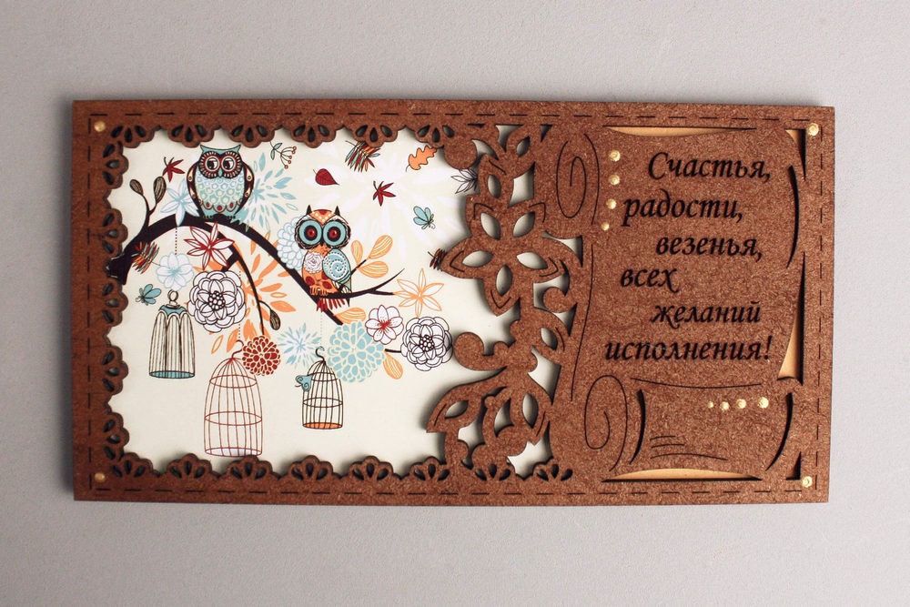 Подарочный конверт с совами (9,2*17,5) МДФ, картон, окрашен. морилкой, оформл., Дуб-желтый, 1 шт.