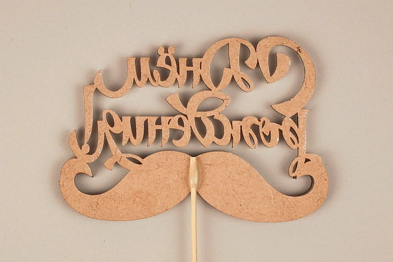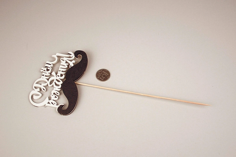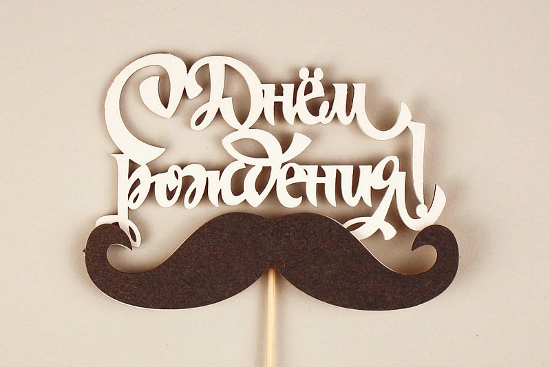 Топпер "С Днём Рождения!" с усами (12*30) МДФ 3мм, окрашен., оформл., Белый-черный, Уп-10 шт.