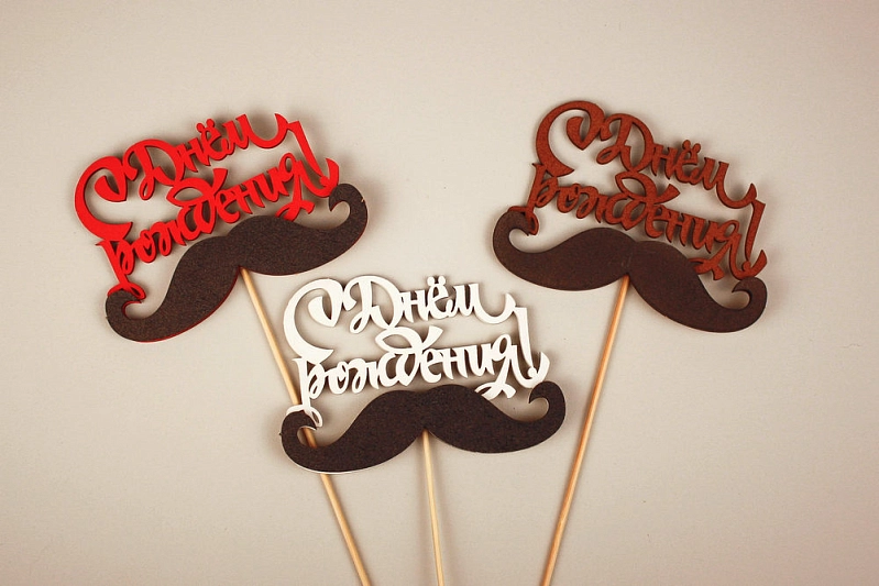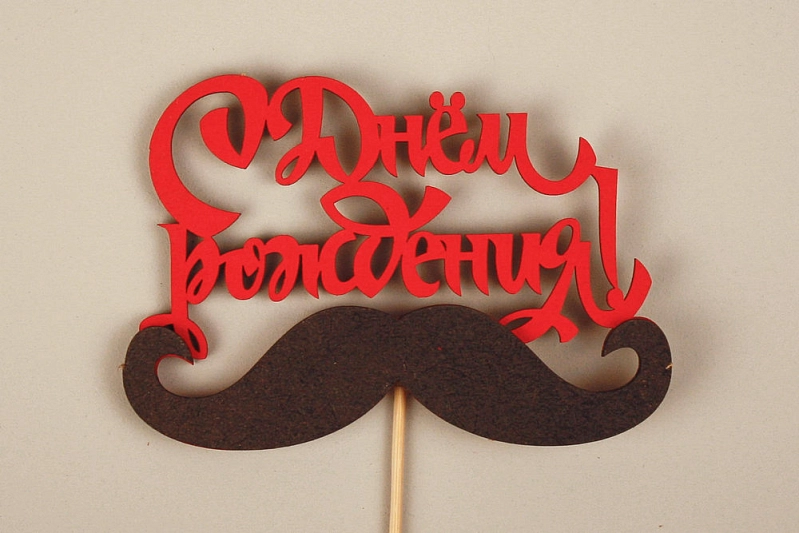Топпер "С Днём Рождения!" с усами (12*30) МДФ 3мм, окрашен., оформл., Красный-черный, 1 шт.