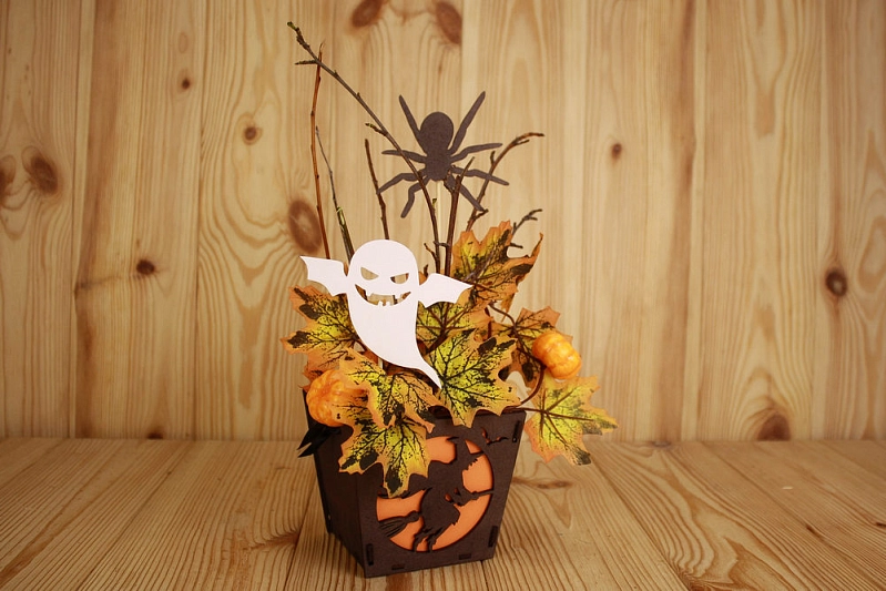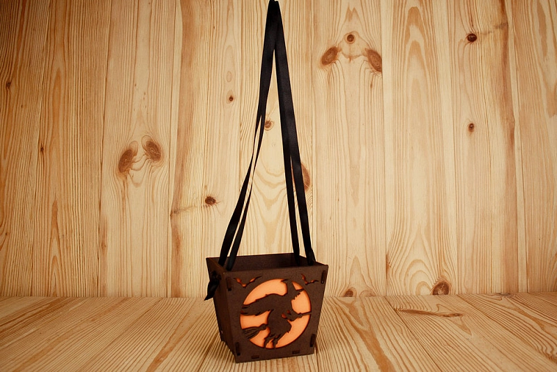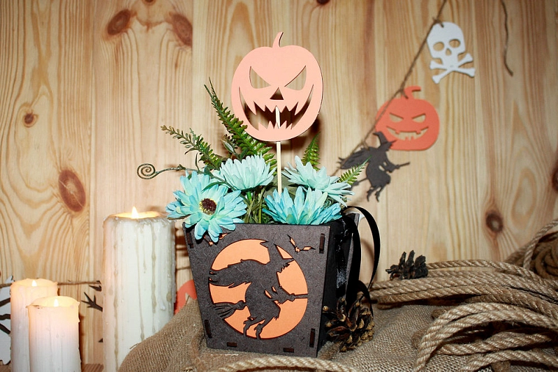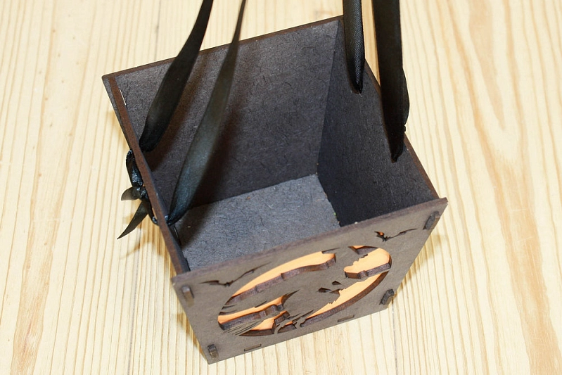 ПУ585-00-4815 Подарочная упаковка к Хэллоуину, средняя (12*12*10,5) МДФ 3мм, окрашен. морилкой, оформл., Эбеновое дерево-оранжевый, 1 шт.