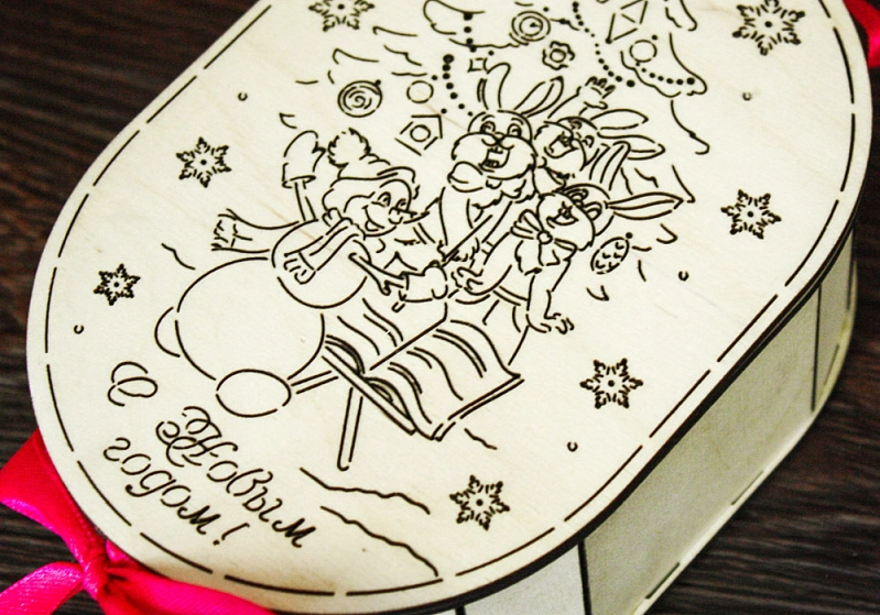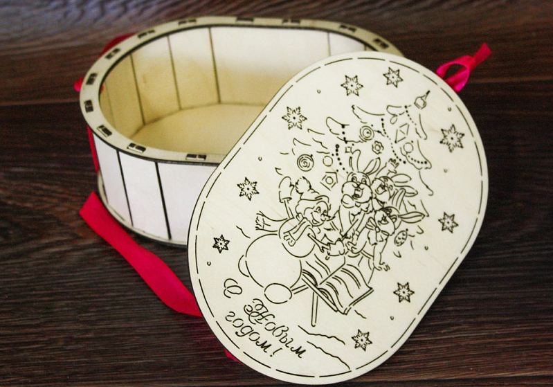 ПУ115-00-0010 Подарочная коробка "С Новым годом!" овальная малая (16*11*6) Фанера 3мм, неокраш., оформл. 1 шт.