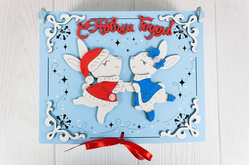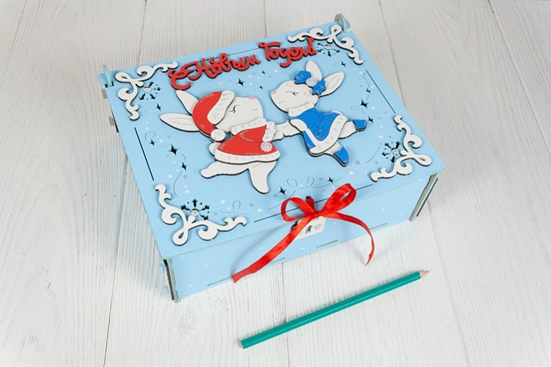 ПУ820-02-0703 Подарочная коробка "С Новым годом!" с зайками (24*19,5*8,5) МДФ, окрашен., оформл., Голубой-белый, 1 шт.