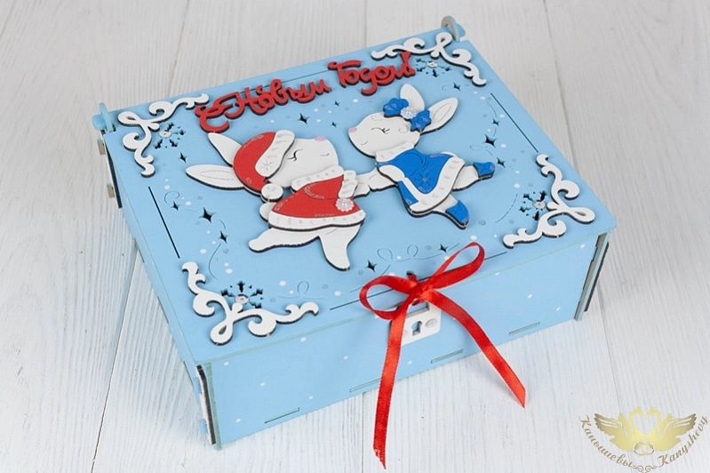 Коробка выполнена в нежных голубо-белых тонах и украшена милыми зайками в новогодних костюмах. 🐰 Такое оформление обязательно вызовет улыбку у получателя и создаст праздничное настроение.