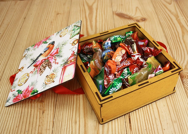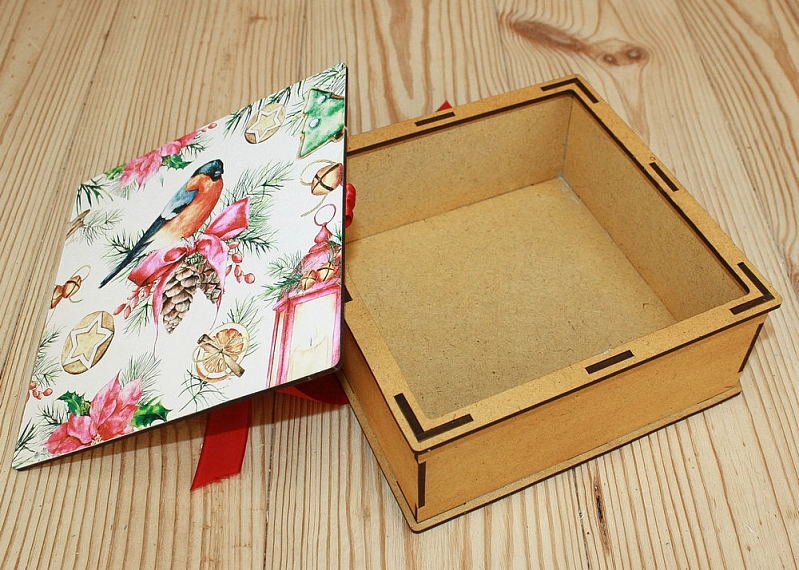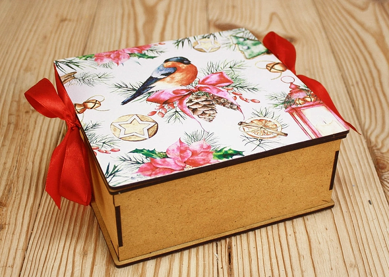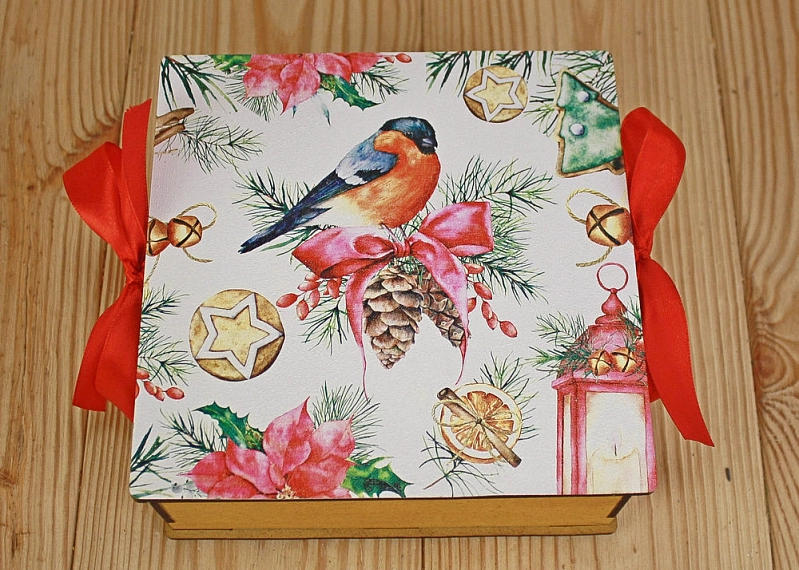 ПУ571-00-3606 Подарочная коробка со снегирём (16,6*16,6*7) МДФ 3мм, УФ печать, окраш. морилкой, оформл., Лимон, 1 шт.