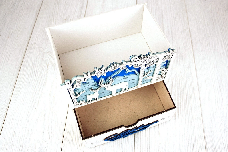 ПУ693-02-0308 Подарочная упаковка-комод "Олени в зимнем лесу" (18,5*13*17,5) МДФ 3мм, окрашен., оформл., Белый-синий, 1 шт.