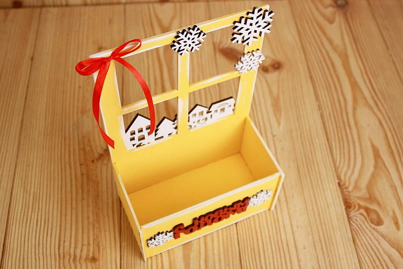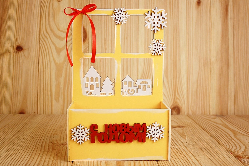 ПУ550-02-1603 Подарочная упаковка-конверт "С Новым годом!" с окном (15,5*9*23,5) МДФ 3мм, окрашен., оформл., Желтый-белый, 1 шт.