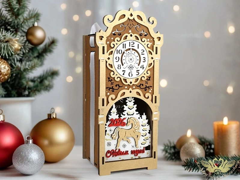 ПУ891-02-3701 Подарочная упаковка-кормушка, с ёлочной игрушкой "Лошадка 2026" (12*10*27) МДФ, окрашен. морилкой, оформл., Дуб-золото, 1 шт.