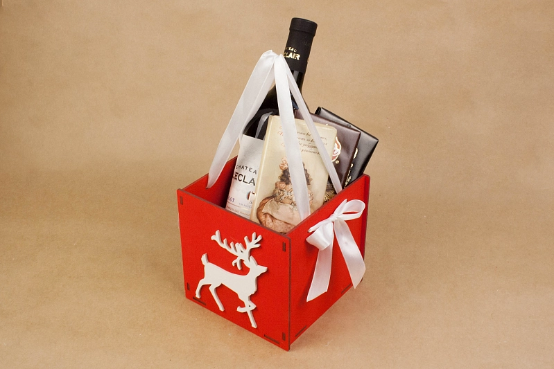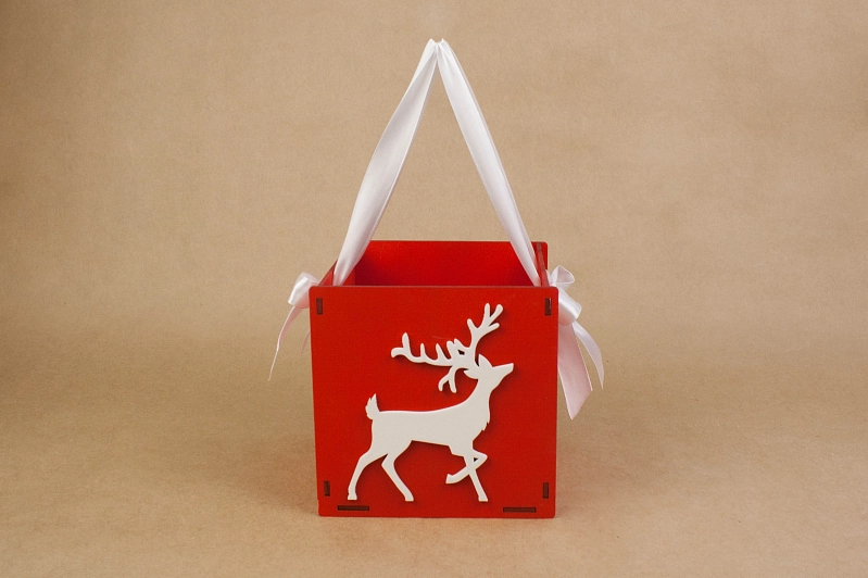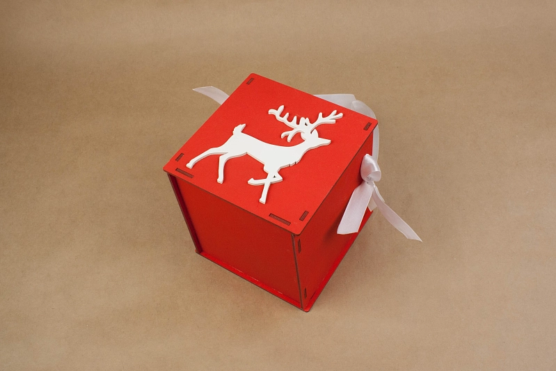 ПУ253-02-0603 Подарочная упаковка "Лесной олень" (15*15*15) Фанера 3мм, окрашен., оформл., Красный-белый, 1 шт.