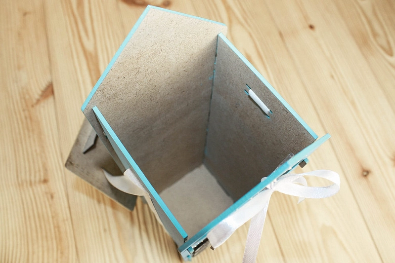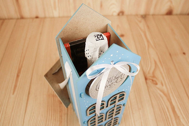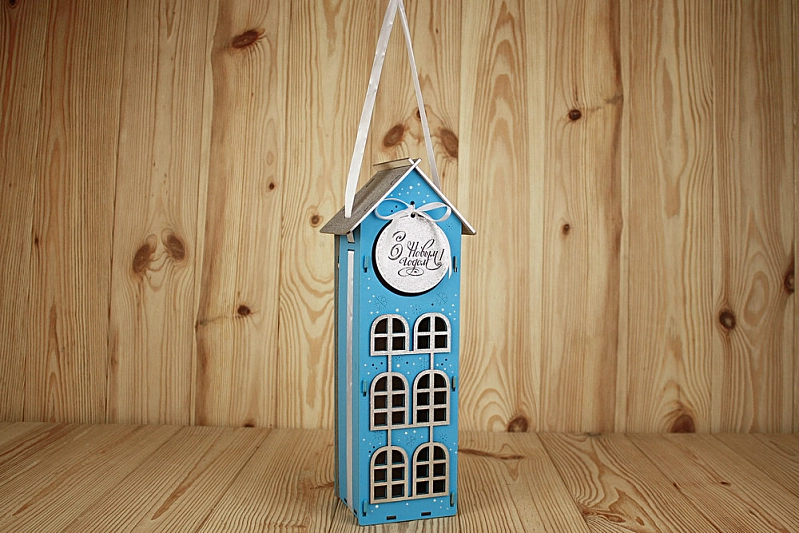ПУ590-02-0702 Подарочная упаковка "Новогодний домик" большой (13,5*11,5*36,5) МДФ 3мм, окрашен., оформл., Голубой-серебро, 1 шт.