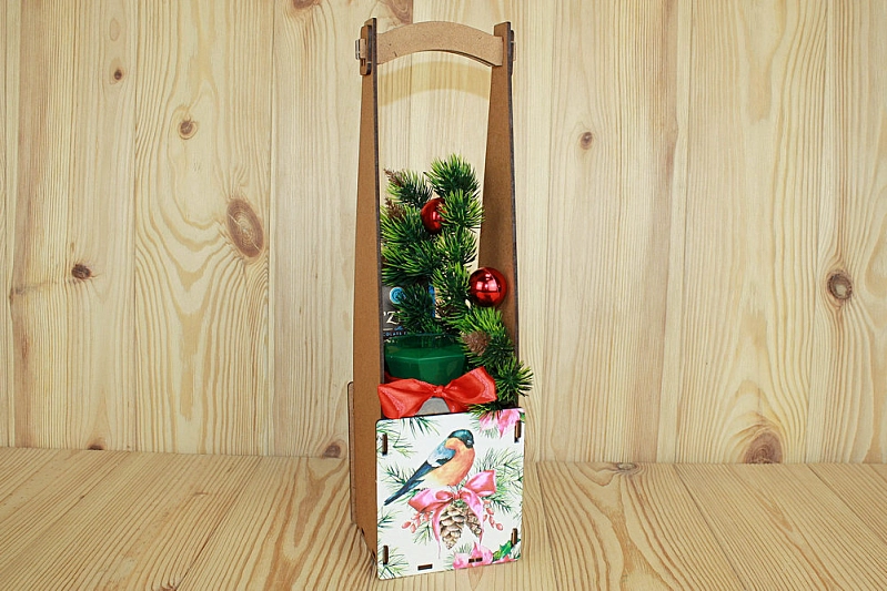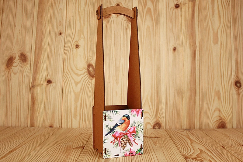 ПУ598-00-3700 Подарочная упаковка под бутылку "С Новым годом!" со снегирём (10,5*10,5*38) МДФ 3мм, УФ печать, окраш. морилкой, оформл., Дуб, 1 шт.