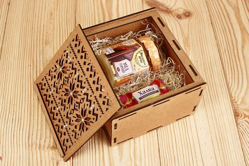 ПУ558-00-3700 Подарочная упаковка с выдвижной крышкой "Норвежская" малая (16*14,5*9,2) МДФ 3мм, окрашен. морилкой, оформл., Дуб, 1 шт.