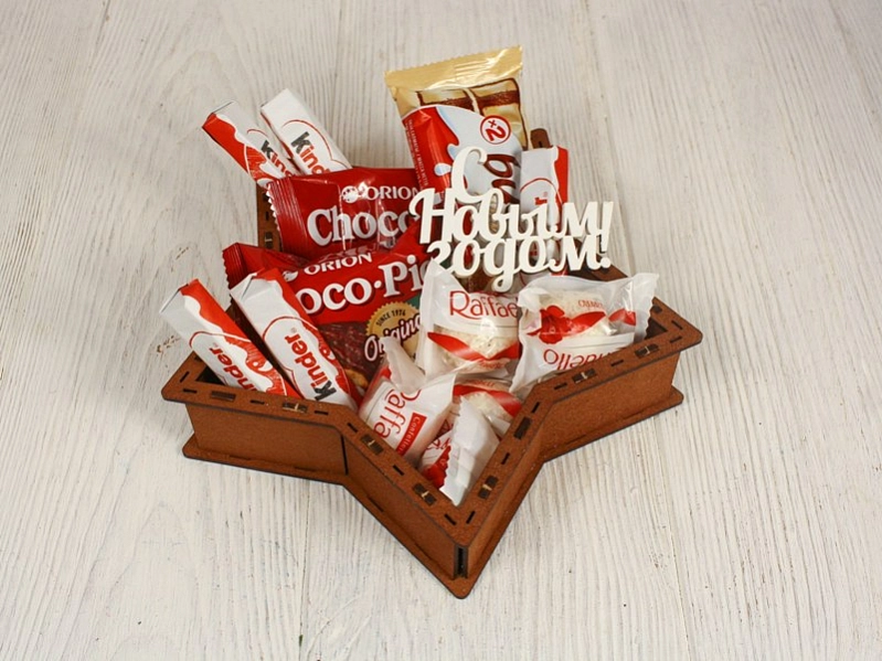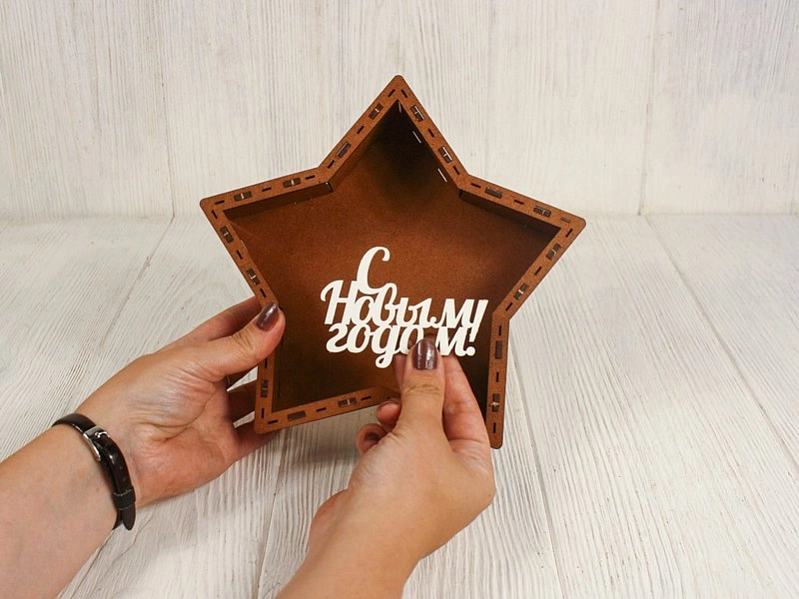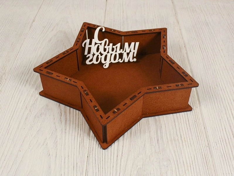 ПУ811-02-3703 Подарочная упаковка-звезда с топпером "С Новым годом!" малая (21*21*4,5; топпер 8,5*6) МДФ, окрашен. морилкой, оформл., Дуб-белый, 1 шт.