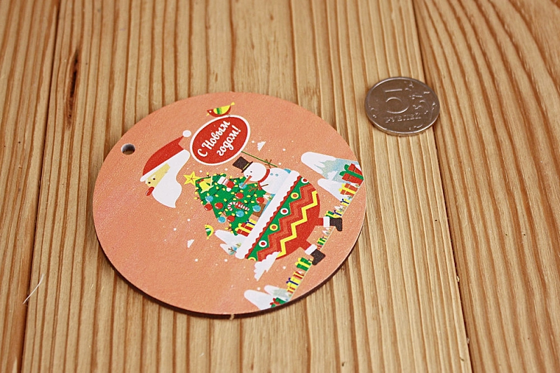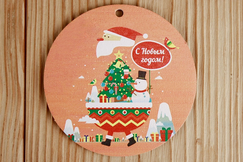 Шлд76-00-0000Н Шильдик "С Новым годом!" с Дедом Морозом, круг (8,5*8,5) МДФ 3мм, УФ печать, Уп-10 шт.