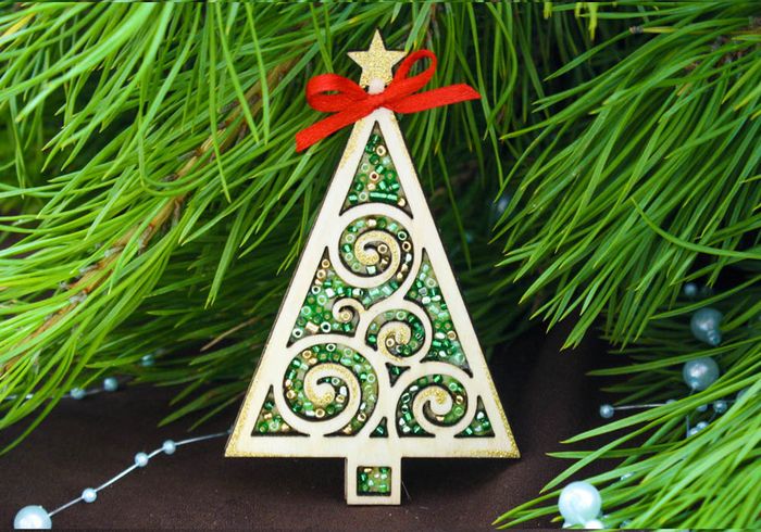 Сувенир-магнит Ёлочка" ажурная с бисером (6,5*10) Фанера 3мм, неокраш., оформл., Зелёный-золото, 1 ш