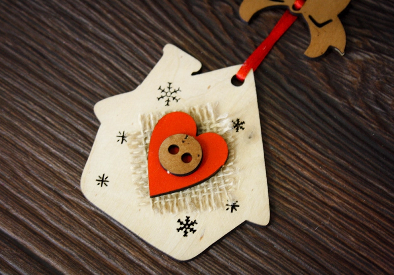 Ёлочное украшение "Домик" с подвесным элементом (8,5*8) Фанера 3мм, окрашен. морилкой, оформл., Дуб-красный, 1 шт.