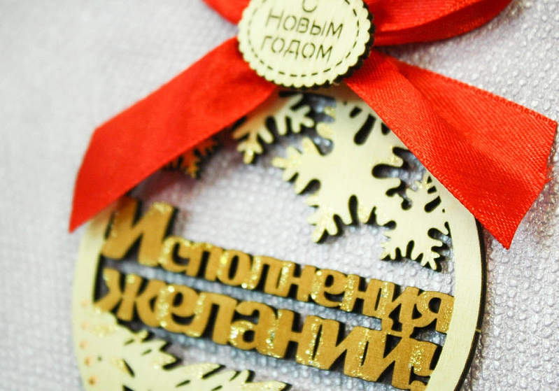 Ёлочное украшение "Исполнения желаний!" с бантом (8*10) Фанера 3мм, окрашен. морилкой, оформл., Дуб-красный. 1 шт.
